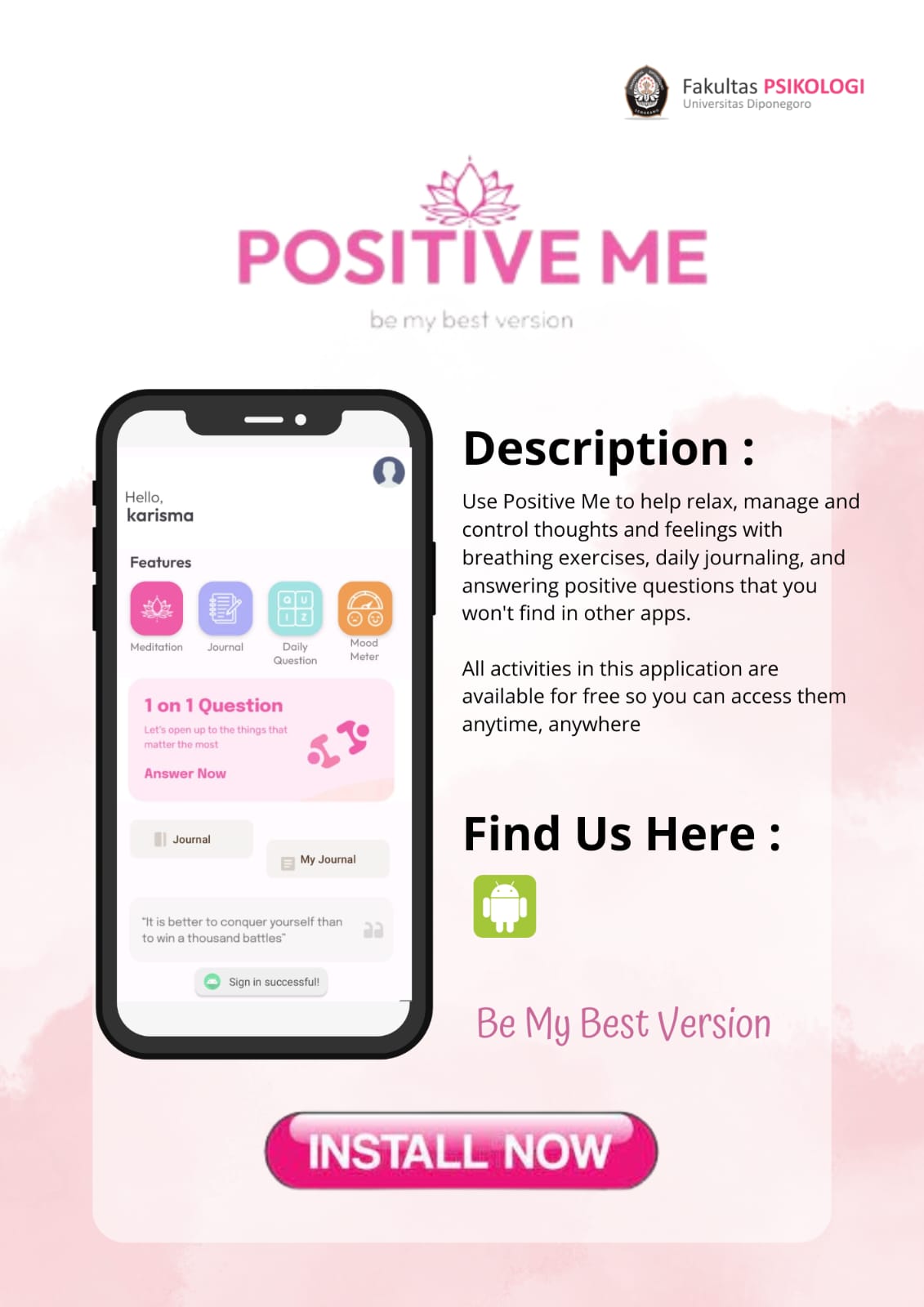 Positive Me dapat menjadi media yang membantu proses terapi atau intervensi psikologi. Terapi stimulus visual, hingga motorik dapat dirasakan di fasilitas teknologi ini. Kelompok 2 telah mengembangkan aplikasi android dengan pendekatan Psikologi Positive beberapa metode, salah satunya metode Katarsis. Aplikasi tersebut dikembangkan menggunakan software Android Studio.